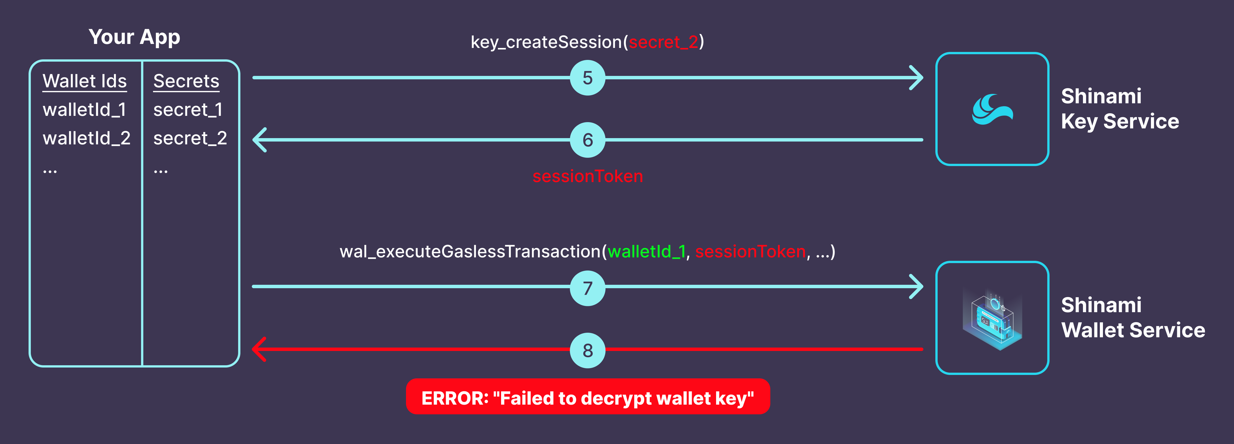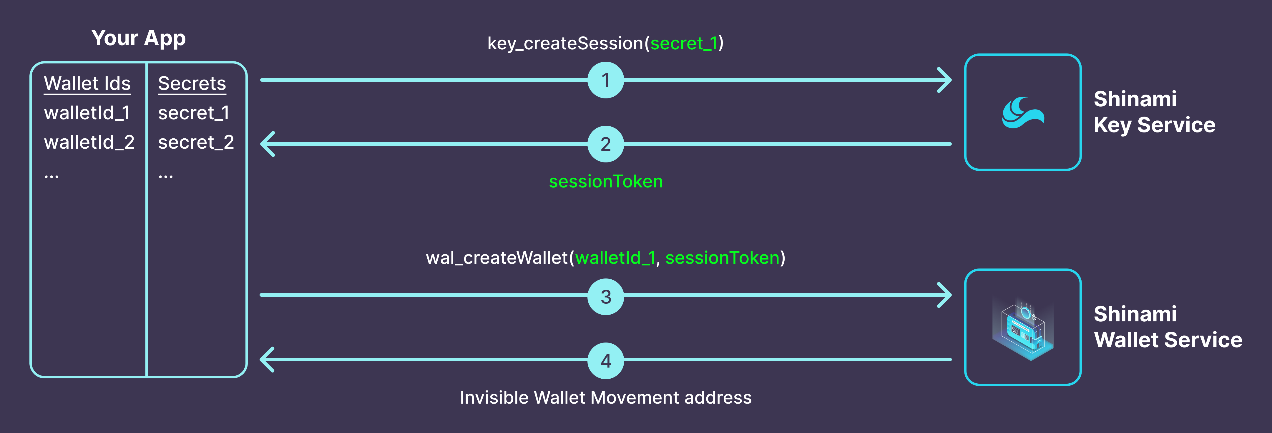 When you create an Invisible Wallet, you must create, store, link, and never change the following two values:walletId: Your internal id for a wallet. When you provide us awalletIdin a method call, it tells us which Invisible Wallet to use. It could be your internaluserIdvalue, or a new arbitrary and unique value you link to theuserId.secret: Your internal secret for a wallet. ThesessionTokenyou generate with it is combined with Shinami data to obtain a signature from the associated wallet. Ideally it would be different for each wallet so that if onesecretis compromised the rest are not.