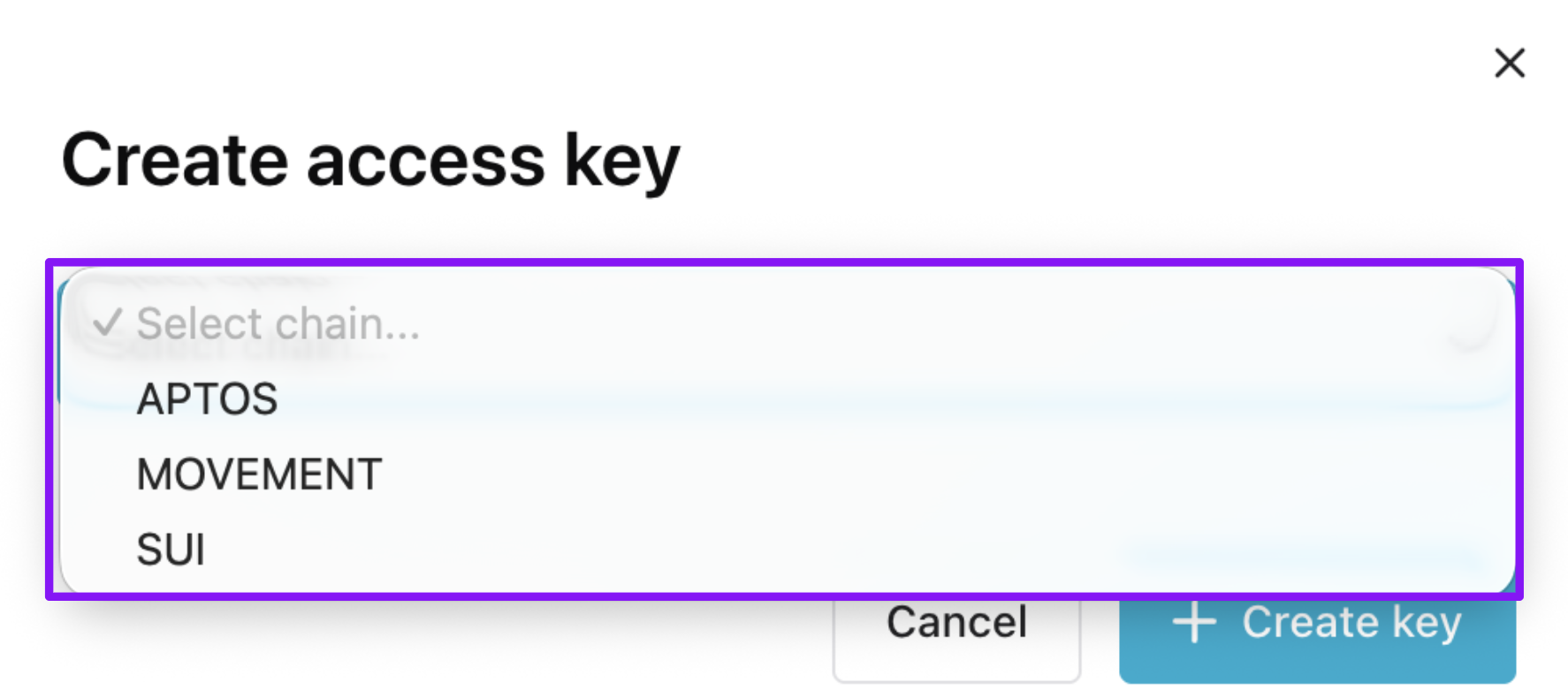 All access key creations start with clicking ”+ Create Key” on the Access Keys page of your dashboard and then selecting a chain.