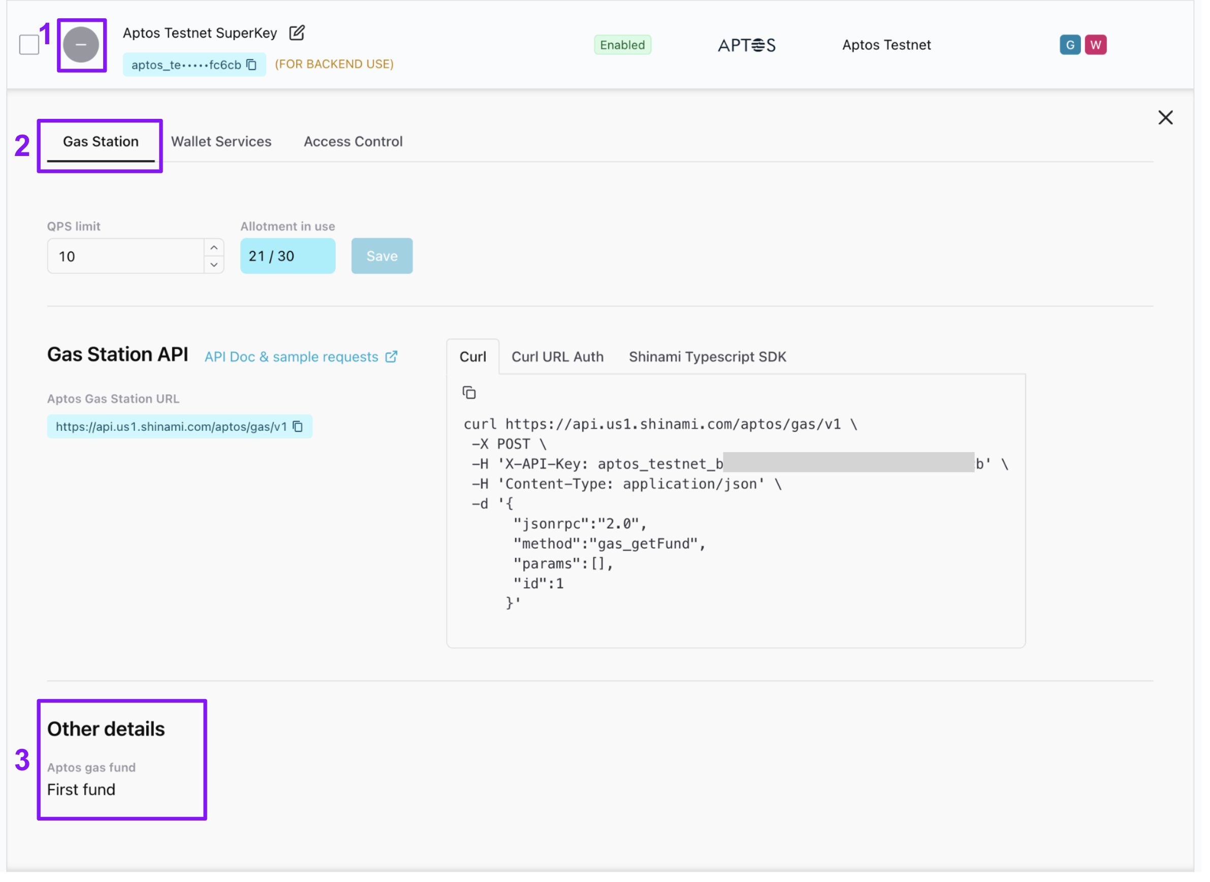 On the “Funds” tab of the Aptos Gas Station page in your Shinami dashboard, click “View” in the “Details” column next to the fund: