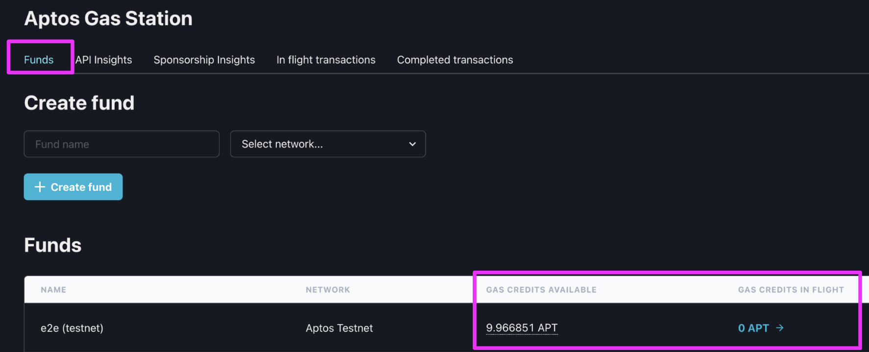 There are two main ways to do this:- Manually in your Shinami Dashboard on the “Funds” tab of the Aptos Gas Station page by looking at the “Funds” table. The “Gas Credits Available” column is the total amount in a fund, and the “Gas Credits in Flight” column is the portion of that being held for active sponsorships. So, the amount you can use for new sponsorships is “Gas Credits Available” - “Gas Credits in Flight”