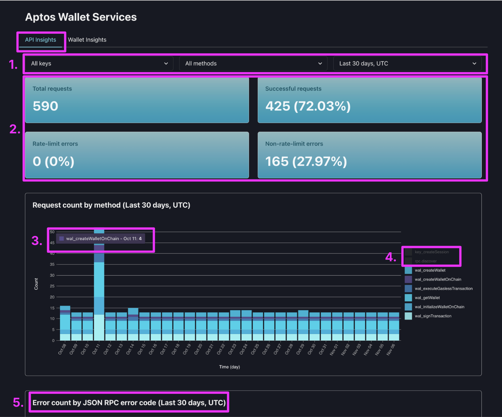Visit the “API Insights” tab of the Aptos Wallet Services page in your Shinami dashboard.