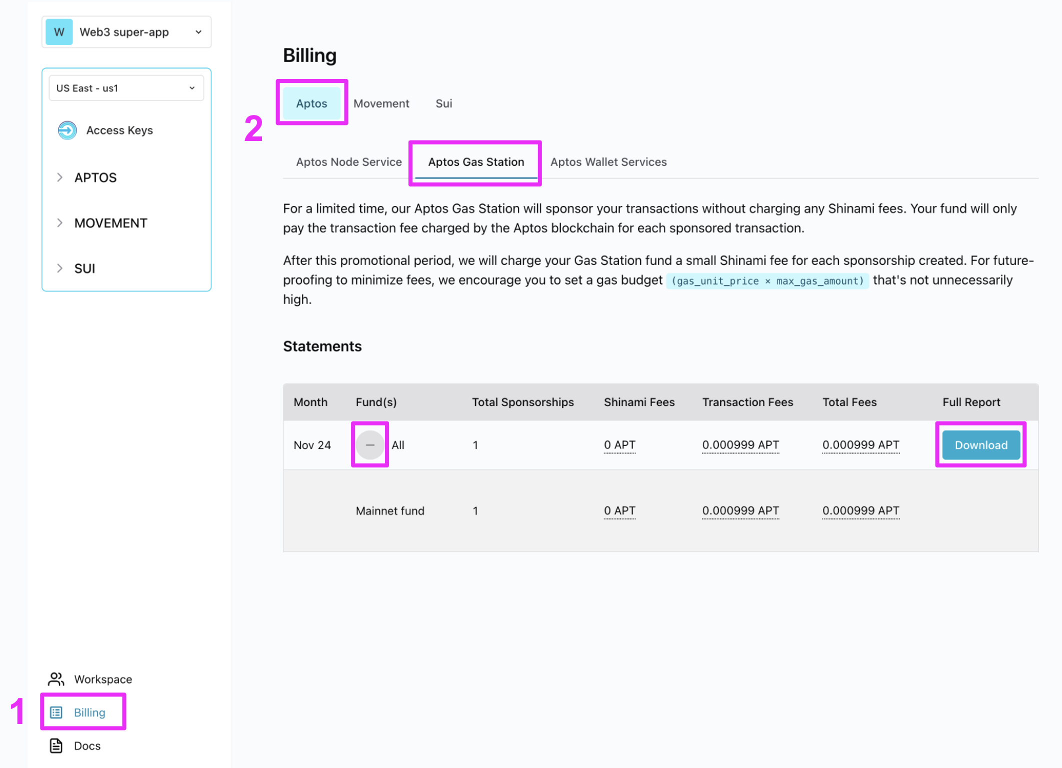 We provide a monthly report of your sponsorship activity for your Mainnet funds. Visit the “Aptos Gas Station tab” of the Billing page in your Shinami dashboard to see the “Statements” table. You’ll find an entry for each month you’ve been sponsoring transactions on Mainnet. We add an entry for a new month 3-4 days after it ends. You can see a summary of your total sponsorships, as well as the total Aptos transaction fees and Shinami fees for those transactions. Click the+ next to All in the Fund(s) column to see a breakdown by fund. I’ve clicked it below so now it’s a - that I can click to close the expanded row.