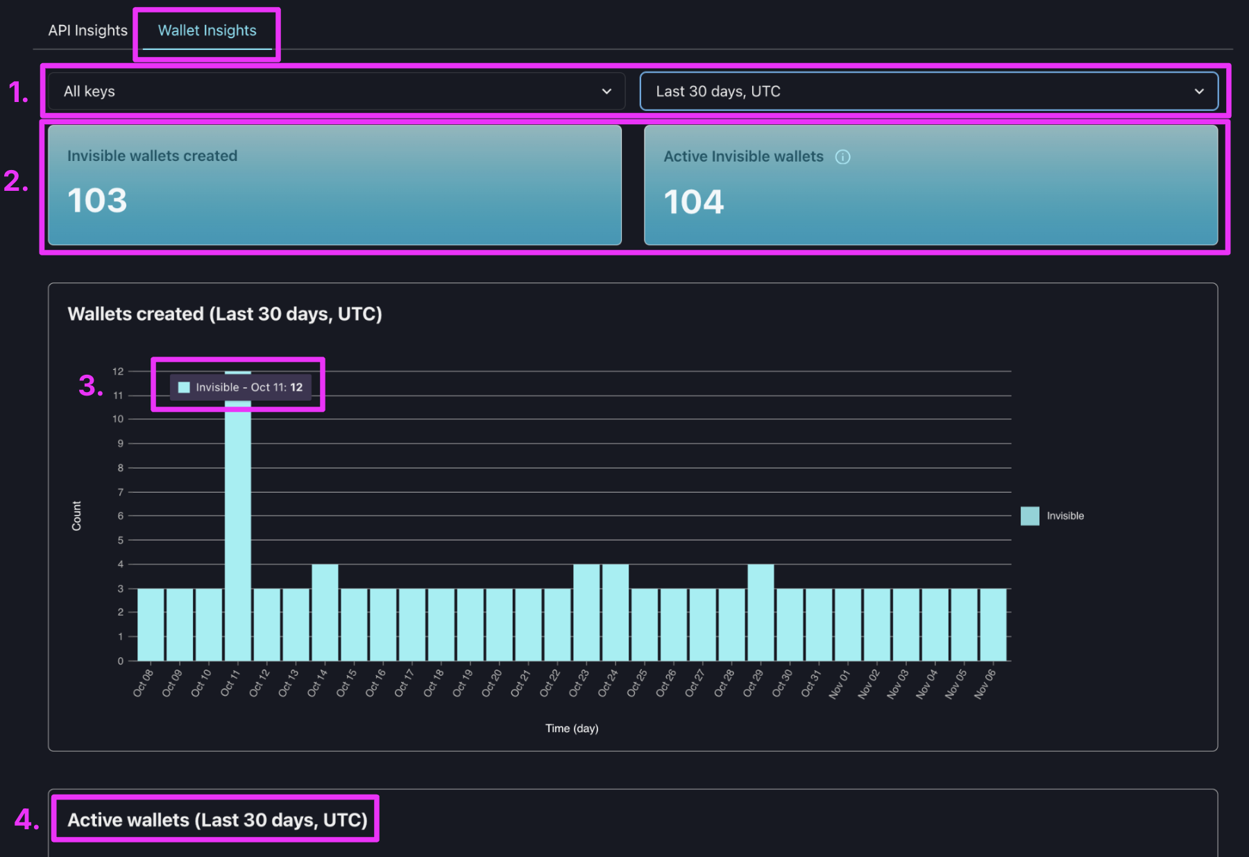- Active wallets: A wallet is considered active if you used it in at least one request during the time period (including the request to create the wallet). In order to provide you with real-time metrics at scale, unique active wallets is an approximate count. Expect an error margin of about 2%, but larger for small sample sizes (e.g. < 100 wallets).