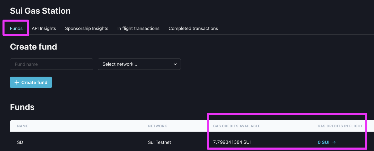 You create funds on the “Funds” tab of the Sui Gas Station page in your Shinami dashboard. A fund is tied to one network (Testnet, Mainnet) and you can have up to 10 funds per network. Note that currently there is no option to delete or rename a fund. When you create a fund on Testnet we deposit some SUI in it so you can start testing right away. Sorry, we don’t do that on Mainnet 🥲.