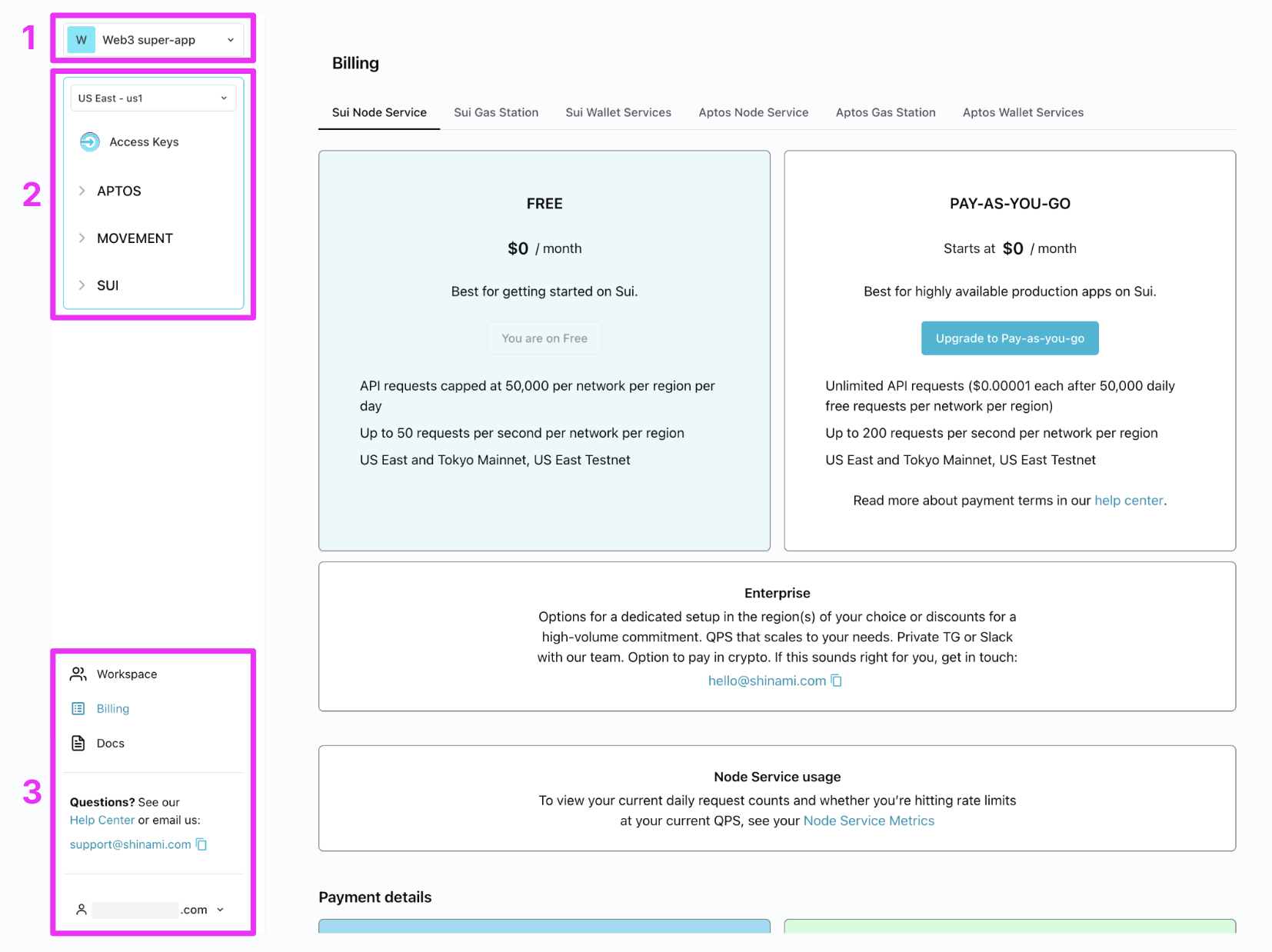 - Region specific pages, outlined with a thin blue box. Here you’ll find the services we host in each region. We only show chain + product pages in a region if the product is running there. API access keys are tied to a region, and to services within that region, so you’ll also find an Access Keys page. If you use our Sui Node Mainnet service in both