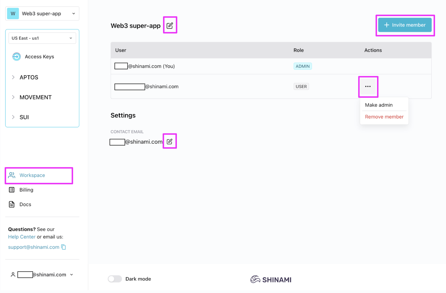 Admin-only operation A workspace admin can change a user’s role or remove them from the workspace on the Workspace page of the Shinami Dashboard. For an existing account with the “user” role, click the three dots in theACTIONS