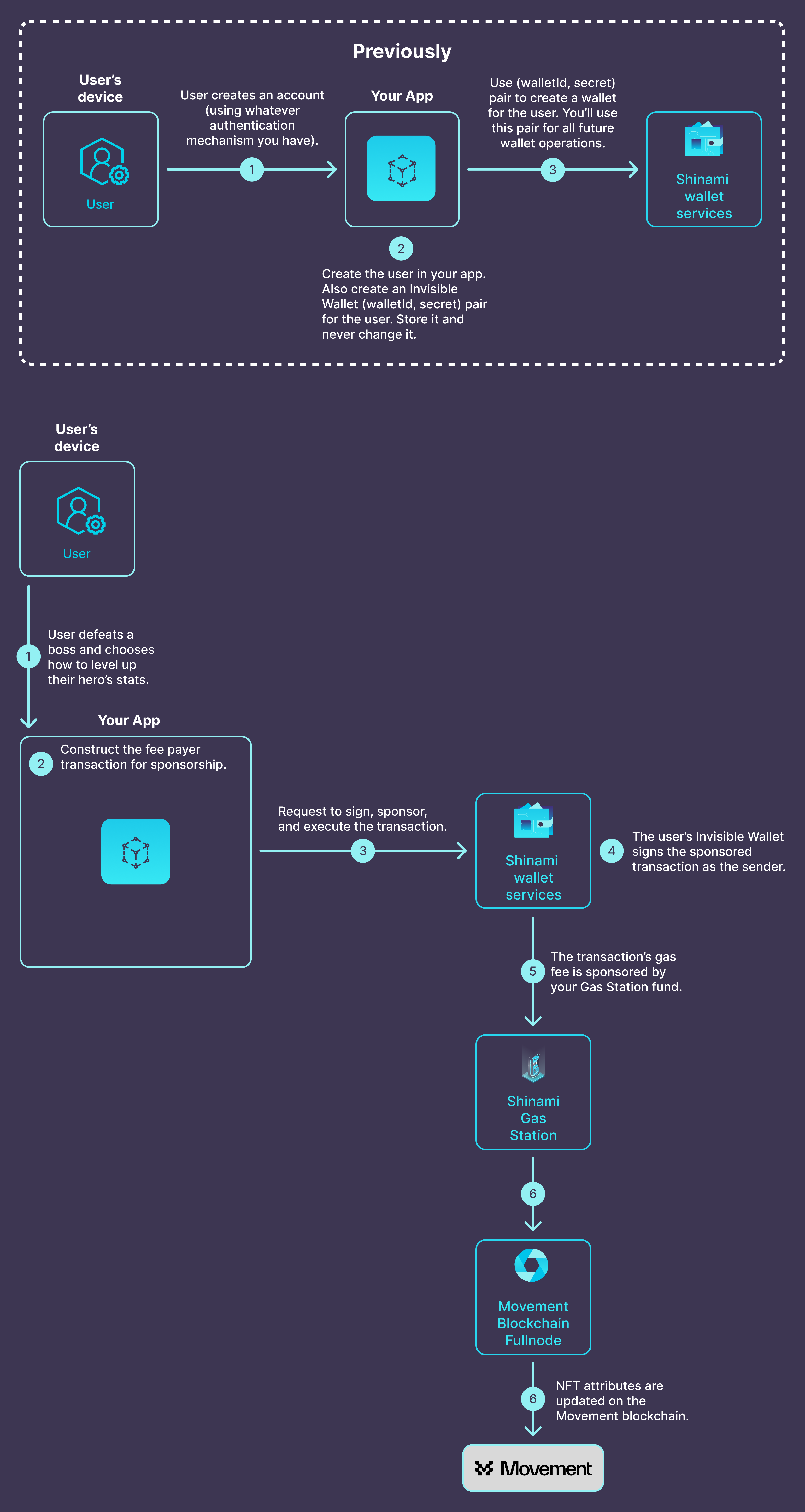 To have a frictionless UX. A connected wallet means users must approve each transaction. This means they don’t need to place a lot of trust in the apps they interact with. These wallets are also portable across apps, so that a user can have one address to interact with all the apps they use if desired. However, these wallets require Web3 familiarity that Web2 users don’t have. They require users to download a wallet app and manage their private keys through seed-phrases. They also present friction that interrupts a user’s engagement with your app, like signing popups. By comparison, Shinami Invisible Wallets abstract away private key management and disruptive signing popups. They offer a convenient, on-chain way to store the assets a user obtains through interacting with your app (for example, an NFT representing an in-game character). Invisible Wallets add no additional action for users because they work with whatever existing authentication your app has in place (e.g. SSO, email+password, magic link, one-time-passcode to email or SMS, no auth, etc). Additionally, Invisible Wallets pair easily with Shinami Gas Station, which enables you to easily pay the small gas fees for your users’ transactions. This means your users don’t have the friction of completing KYC to buy MOVE and then sending it to their wallet, which can lead Web2-native users to abandon your app. Finally, these wallets are tied to your app, meaning a user cannot connect them to another app. This means that another app can’t alter or transfer an NFT you give a user. Invisible Wallets wallets, therefore, offer an on-ramp for Web2-native users onto Web3 applications. They offer ownership that lacks the full user control of connected, self-custody wallets. In exchange, they allow you to provide the great, frictionless user experience that Web2 users are used to. As users get more comfortable with Web3, you can graduate their assets to full self-custody wallets they control if desired.What is a wallet service?